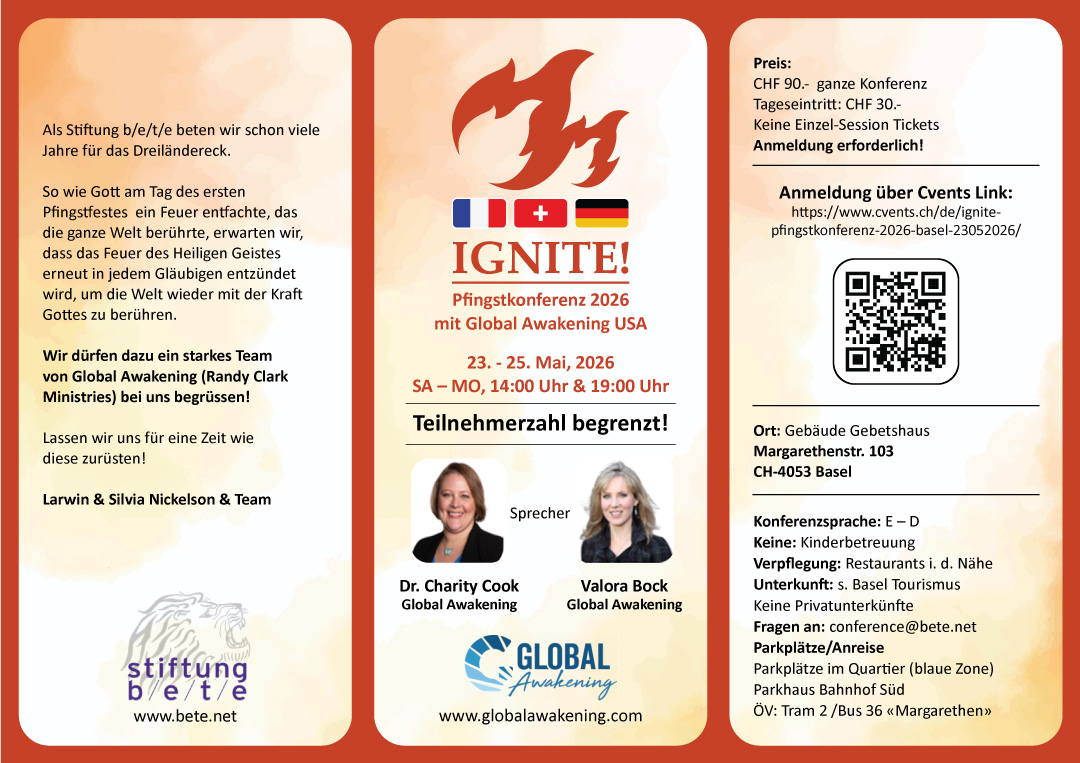 Im Mai (23.-25. Mai 26) veranstalten wir die Pfingstkonferenz IGNITE! mit Dr. Charity Cook und Valora Bock & Team von Global Awakening, USA (Randy Clark Ministries).