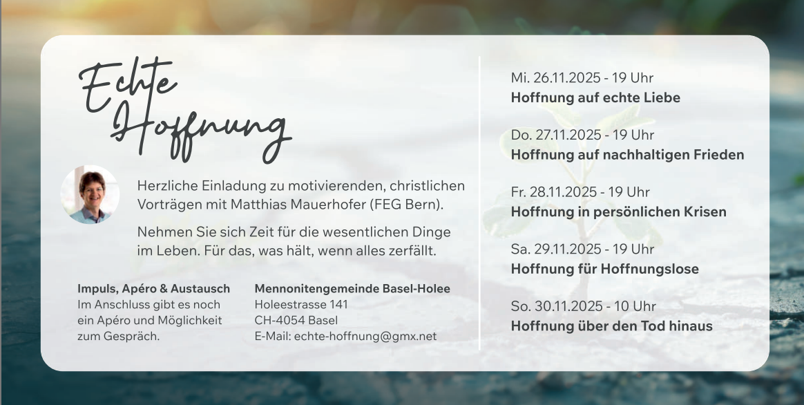 26.11.-30.11.2025 in der Mennonitengemeinde Basel-Holee (Holeestrasse 141, 4054 Basel)